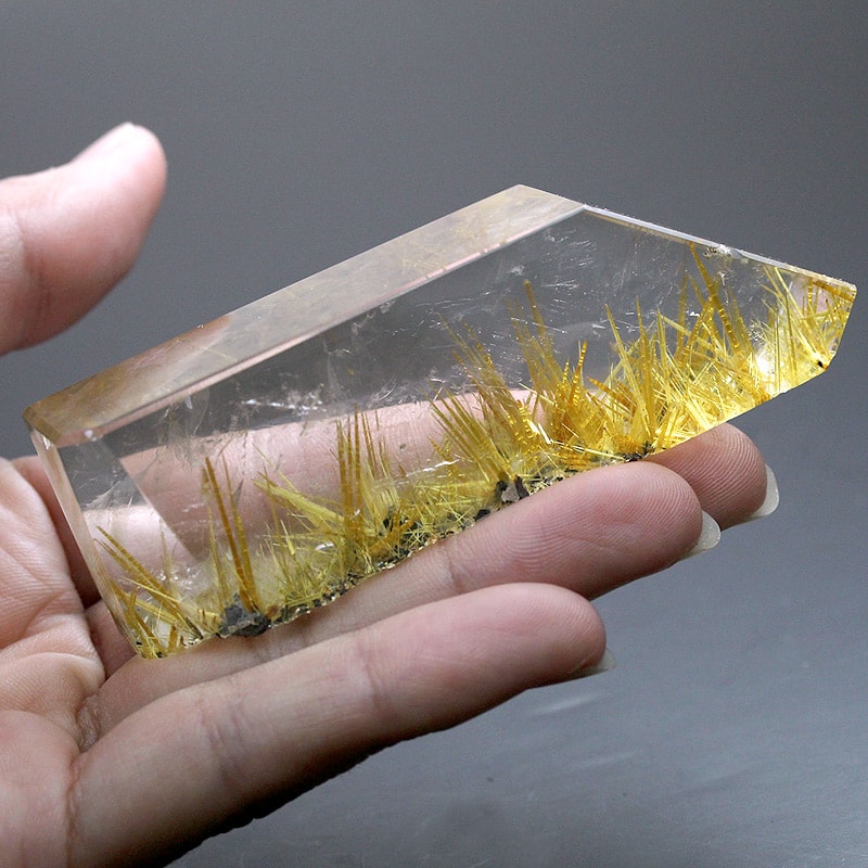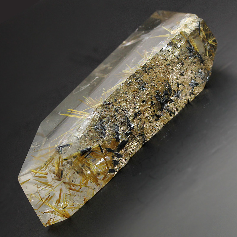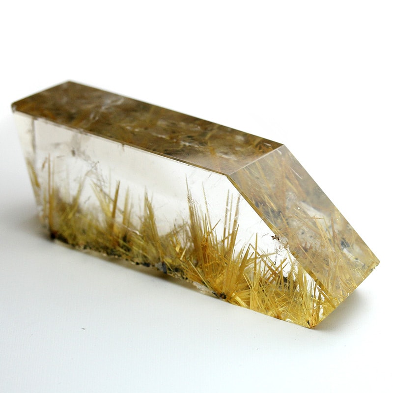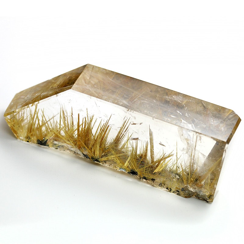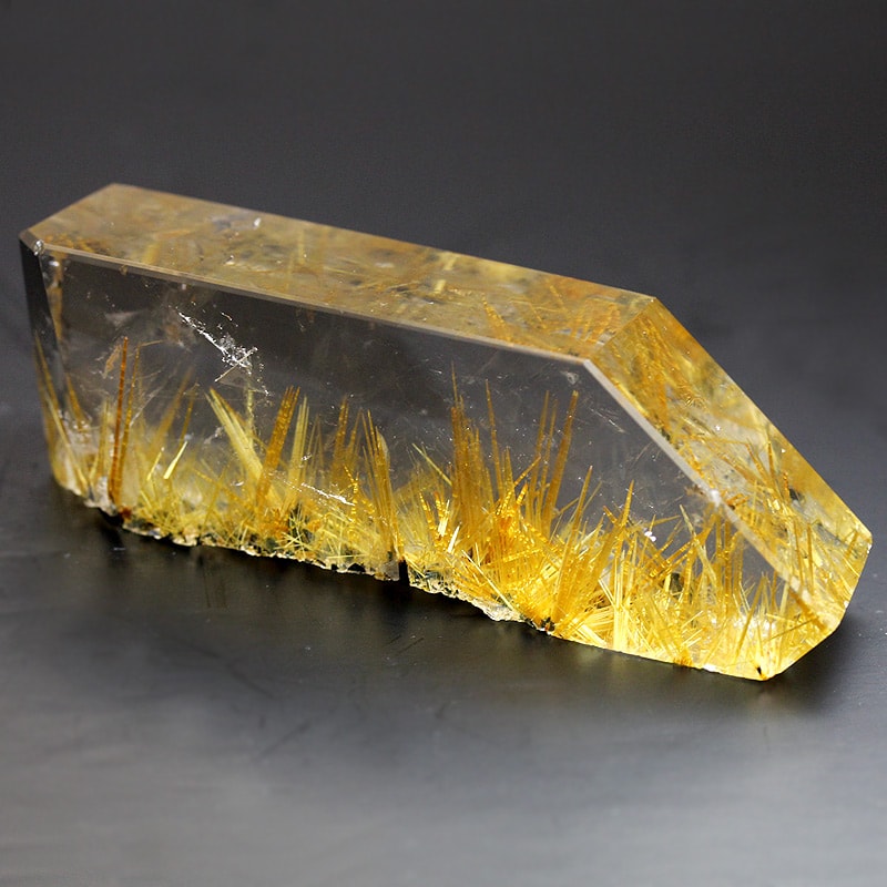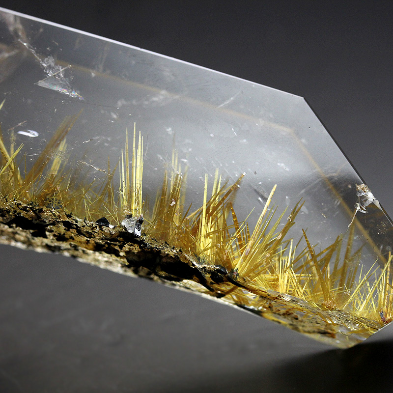 透明感のある水晶の中にまるで土の中から植物が芽を出し成長したかのように黄金のルチルがインクルードしています。これだけ広範囲にわたって同条件でルチルの針が成長しているというのも奇跡的です。