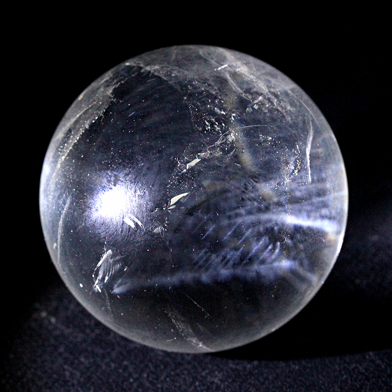 一見すると透明度が高い良質な水晶丸玉ですが、こちらの丸玉は普通の水晶玉ではありません!強い光を当てると・・青白い幾筋もの線が現れます!このような水晶を「ブルーエンジェルラダー水晶」と呼びます。