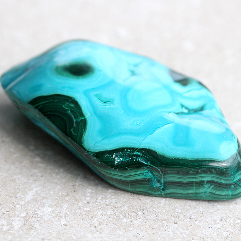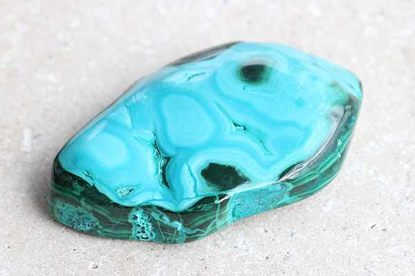 マラカイトのグリーンの濃淡が描く円形模様がはっきりと見られます。