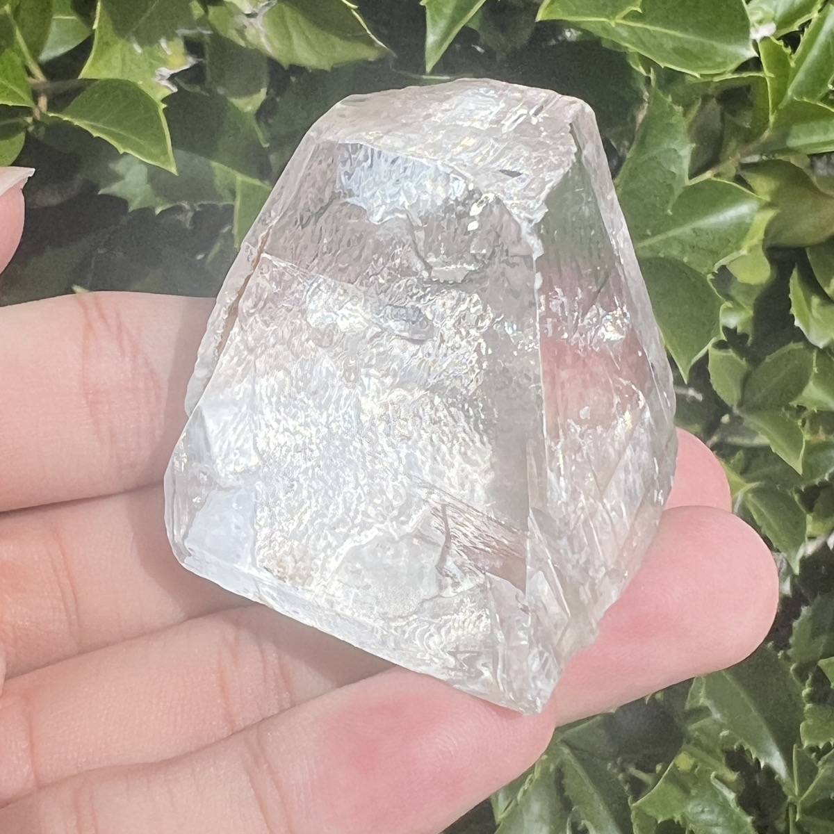 自然光やライトの下で見ると、結晶内部が淡くきらめき、