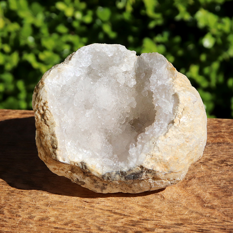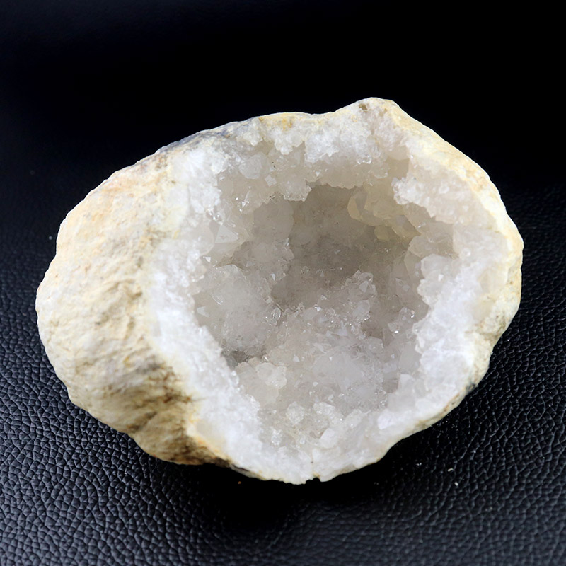 外側は素朴な岩肌、内側には無数の透明な結晶が輝くコントラスト。